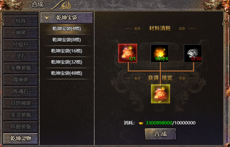 2、玩家可消耗乾坤灵气材料,合成更高级的乾坤宝袋