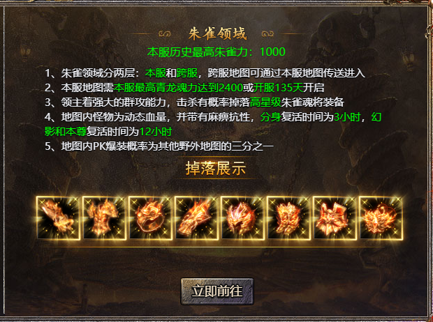 1、朱雀领域分两层:本服和跨服,跨服地图可通过本服地图传送进入