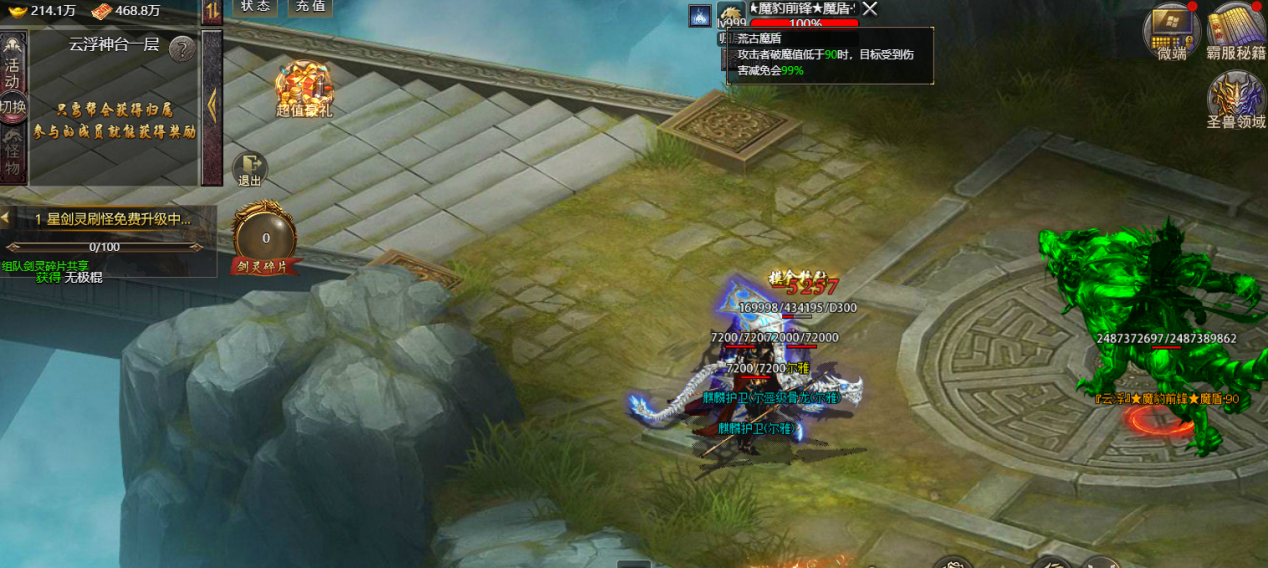 4、新增地图云浮神台,总共2层,第一层120天12转可进入,第二层140天12转可进入。每层云浮神台存活着4只云浮守卫,玩家需要足够的破盾值才能挑战他们。云浮守卫每天15:00和20:30复活,击杀自己帮会归属的守卫后,所有参与的帮会玩家皆可获得奖励,云浮守卫都拥有特殊的动态复活血量