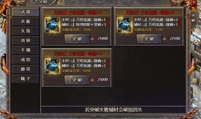 5、装备突破:玩家可以在凛冬遗迹找到荒古装备突破NPC进行装备突破,需要集齐主材料和辅材料才能进行突破,装备突破有概率失败,若突破失败辅材料会破损消失,主材料会保留