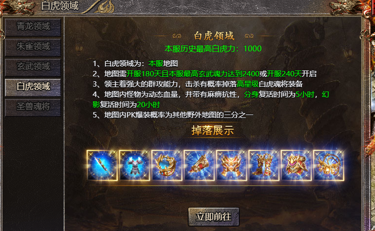 2、开服180天后本服最高玄武魂力达到2400或开服240天可开启白虎领域