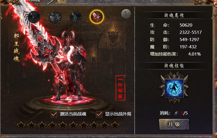 3、使用战魂精元可以提升战魂星数,每满10星可以提升到下一阶