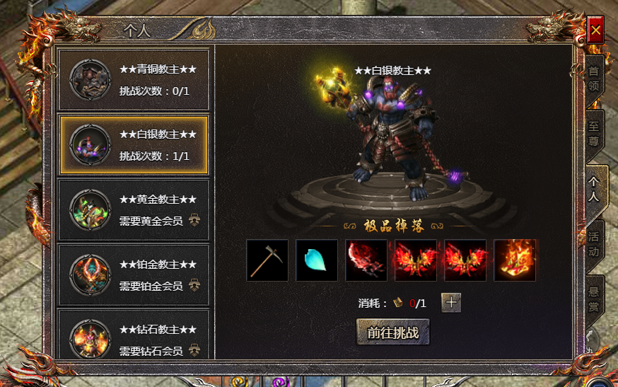 1、可乐游戏《传奇霸主》个人BOSS根据免费会员等级开放,等级越高可挑战的BOSS数量越多,挑战次数也越多