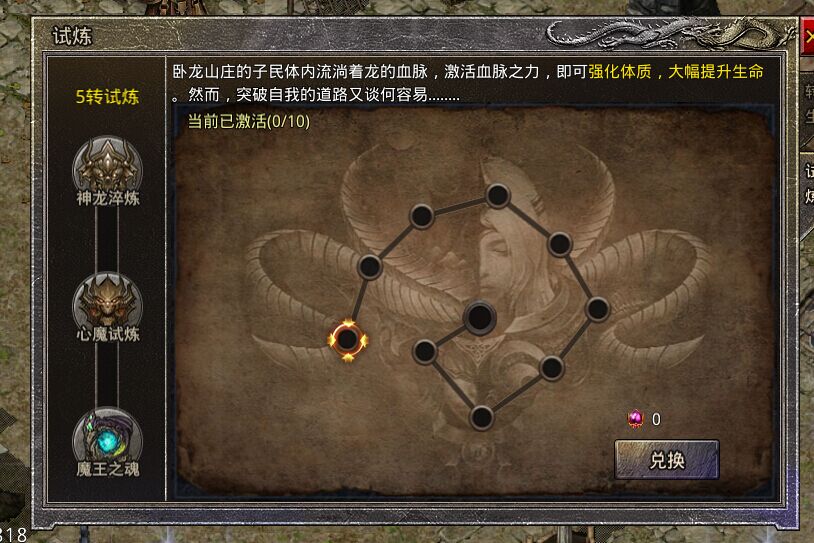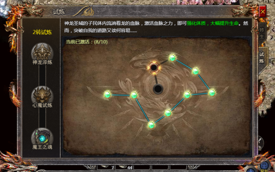 神龙淬炼:消耗血脉精华点亮血量,提升属性(血脉精华可通过元宝和灵符兑换)