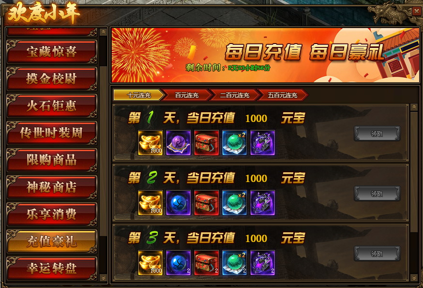 2.连续充值达到3天,奖励翻倍领,更可领取暗影晶石、地狱晶石、随机阵法宝珠宝箱等贵重物品