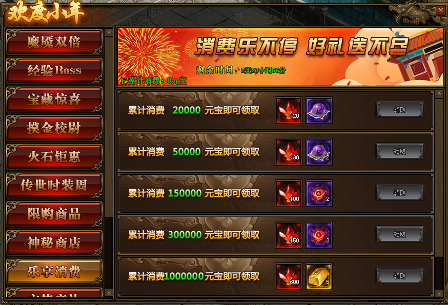 1.活动期间,玩家累计消费满足要求,可以领取境界修为、本职业星石、传世灵戒等相应奖励;