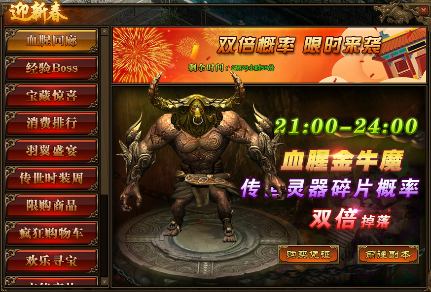 1.活动期间,玩家参与“多人副本-血腥回廊”,获得“传世灵器碎片”的概率翻倍;
