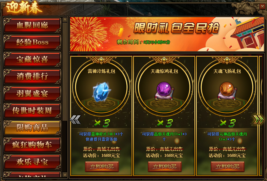 1.活动期间,玩家可在活动面板购买限购商品;(可翻页)