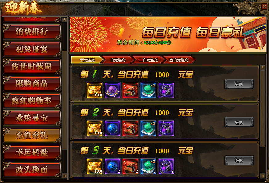 2.连续充值达到3天,奖励翻倍领,更可领取暗影晶石、地狱晶石、随机7级阵法宝珠、雷霆装备等贵重物品