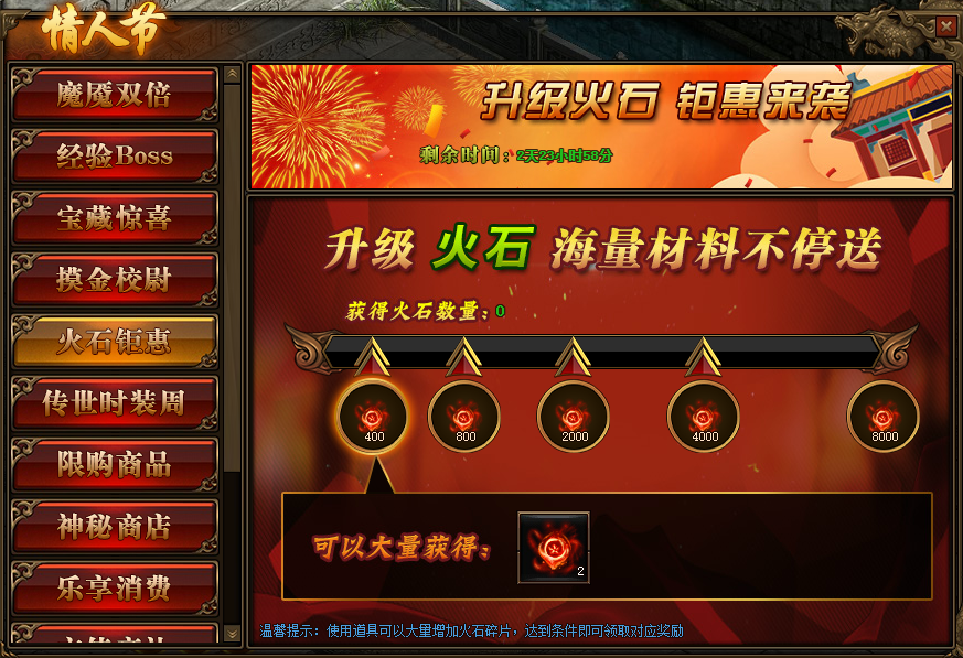 1.活动期间,玩家获得火石碎片数量,达到条件可领取对应火石碎片奖励。
