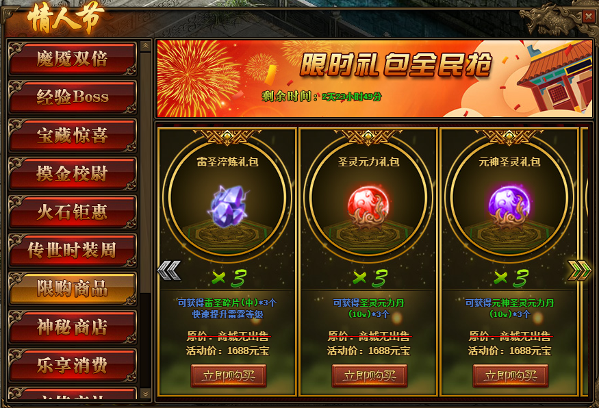 1.活动期间,玩家可在活动面板购买限购商品;(可翻页)