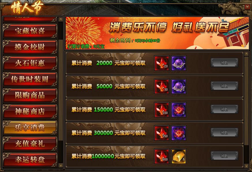 1.活动期间,玩家累计消费满足要求,可以领取境界修为、本职业星石、传世灵戒等相应奖励;