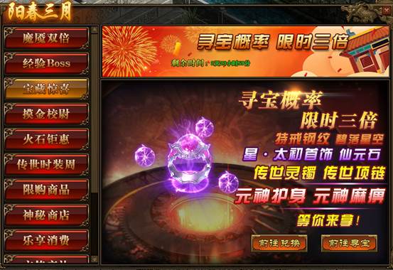 1.活动期间,玩家寻宝概率翻倍,极高几率获得星·太初首饰,特戒钢纹、仙元石、碧落星空,传世灵器、传世灵甲,传世灵器·手镯碎片、传世灵器·项链碎片,元神麻痹特戒以及元神护身特戒