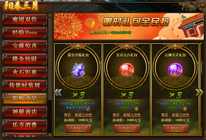 1.活动期间,玩家可在活动面板购买限购商品;(可翻页)