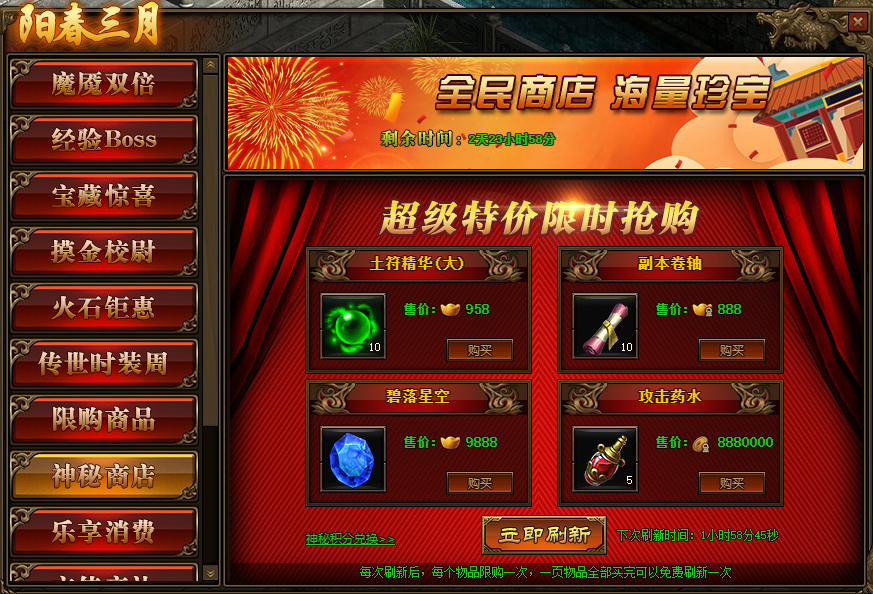 1.活动期间,玩家可在神秘商店中购买商品,商品可用金币,绑元,元宝进行购买;