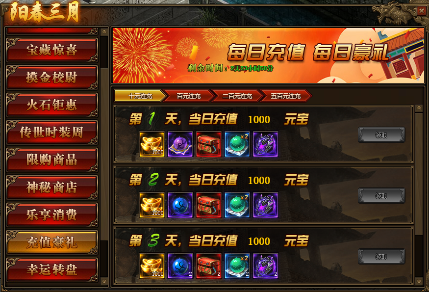 2.连续充值达到3天,奖励翻倍领,更可领取暗影晶石、地狱晶石、随机阵法宝珠宝箱等贵重物品
