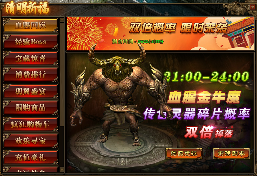 1.活动期间,玩家参与“多人副本-血腥回廊”,获得“传世灵器碎片”的概率翻倍;