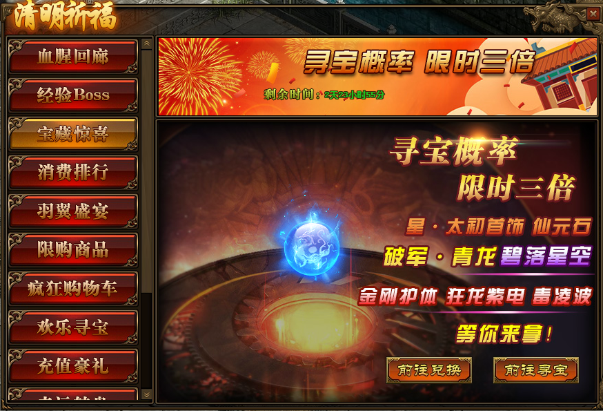 1.活动期间,玩家寻宝概率翻倍,极高几率获得星·太初首饰,特戒钢纹、仙元石、碧落星空,传世灵器、传世灵甲,封神秘法书页以及破军·青龙