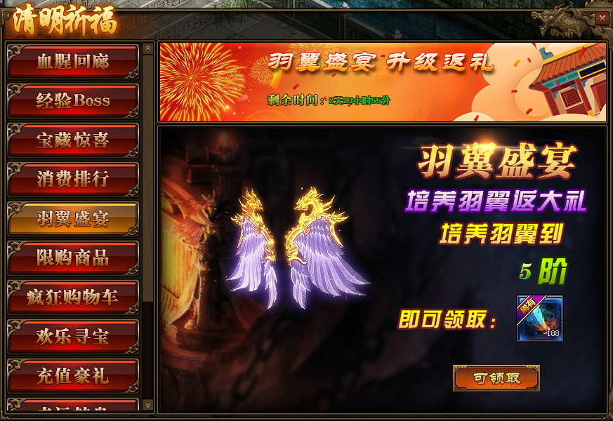 1.活动期间,玩家羽翼只需达到5级,即可领取一定数量的羽毛;