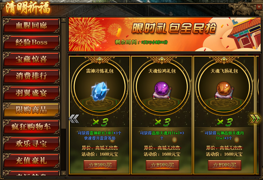 1.活动期间,玩家可在活动面板购买限购商品;(可翻页)