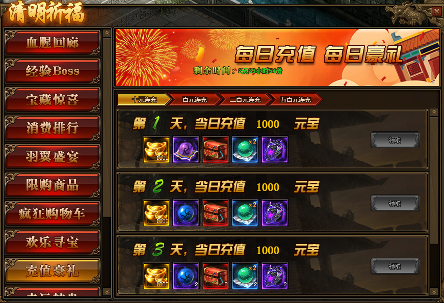 2.连续充值达到3天,奖励翻倍领,更可领取暗影晶石、地狱晶石、随机7级阵法宝珠、雷霆装备等贵重物品