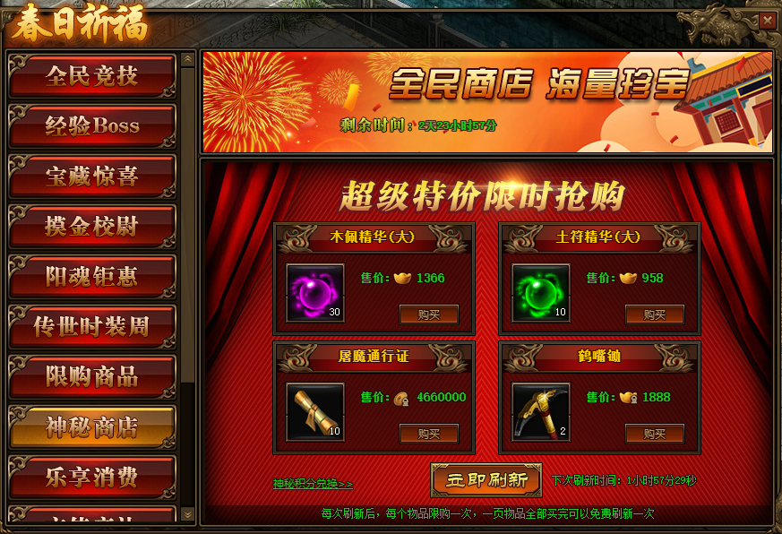 2.神秘商店每2小时自动刷新一次,也可用花费元宝立即刷新;