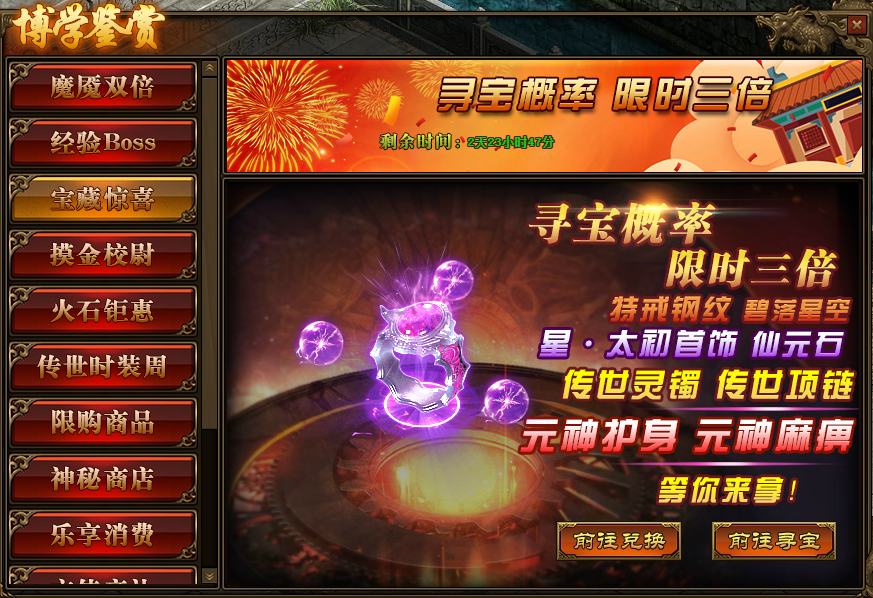 1.活动期间,玩家寻宝概率翻倍,极高几率获得星·太初首饰,特戒钢纹、仙元石、碧落星空,传世灵器、传世灵甲,传世灵器·手镯碎片、传世灵器·项链碎片,元神麻痹特戒以及元神护身特戒