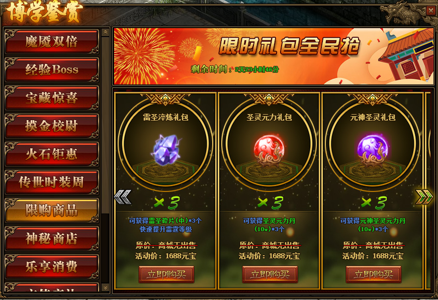 1.活动期间,玩家可在活动面板购买限购商品;(可翻页)