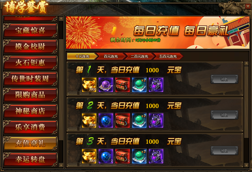 2.连续充值达到3天,奖励翻倍领,更可领取暗影晶石、地狱晶石、随机阵法宝珠宝箱等贵重物品