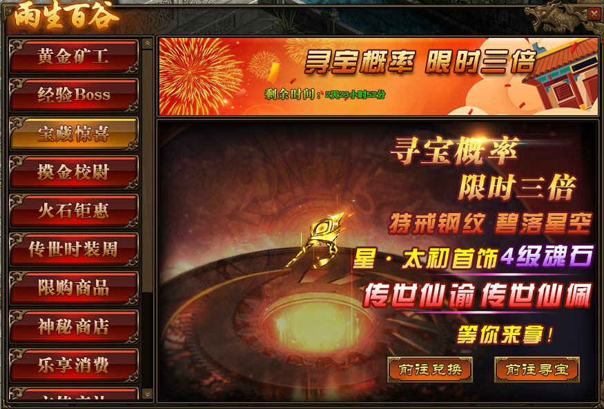 1.活动期间,玩家寻宝概率翻倍,极高几率获得星·太初首饰,传世灵器、传世灵甲,特戒钢纹,仙元石、碧落星空,传世灵器、传世灵甲,高级天魂石、四级魂石,传世灵器·仙谕以及传世灵器·仙佩