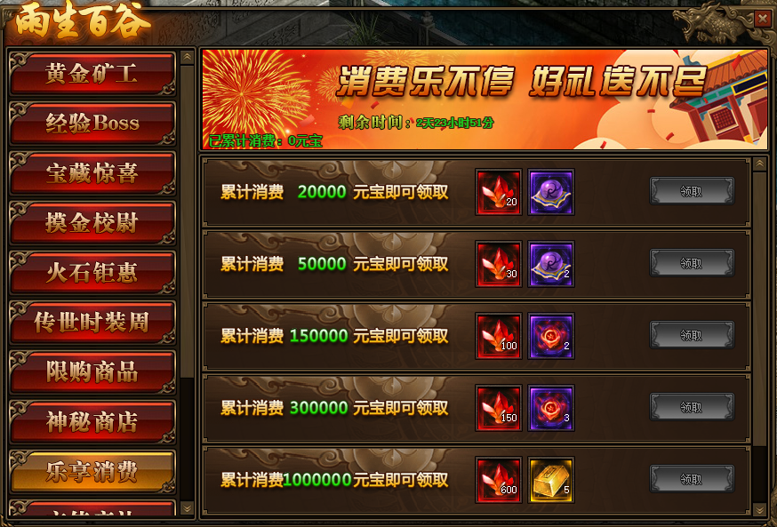 1.活动期间,玩家累计消费满足要求,可以领取境界修为、本职业星石、传世灵戒等相应奖励;