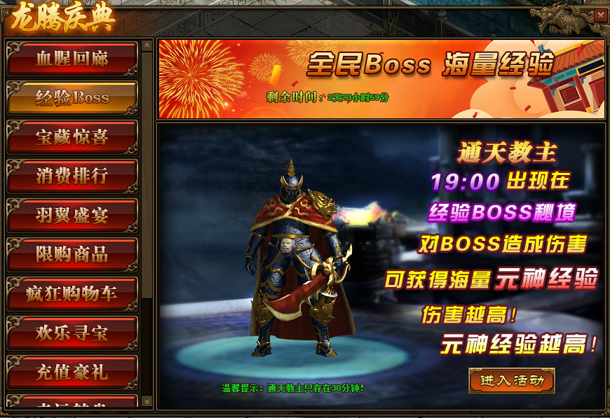 2.活动中,玩家对BOSS造成的伤害,将在活动结束后转换成元神经验并发放;