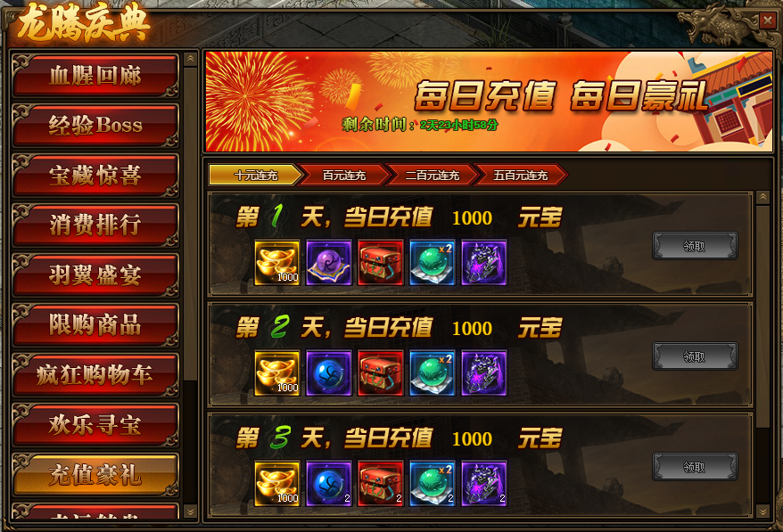 2.连续充值达到3天,奖励翻倍领,更可领取暗影晶石、地狱晶石、随机7级阵法宝珠、雷霆装备等贵重物品