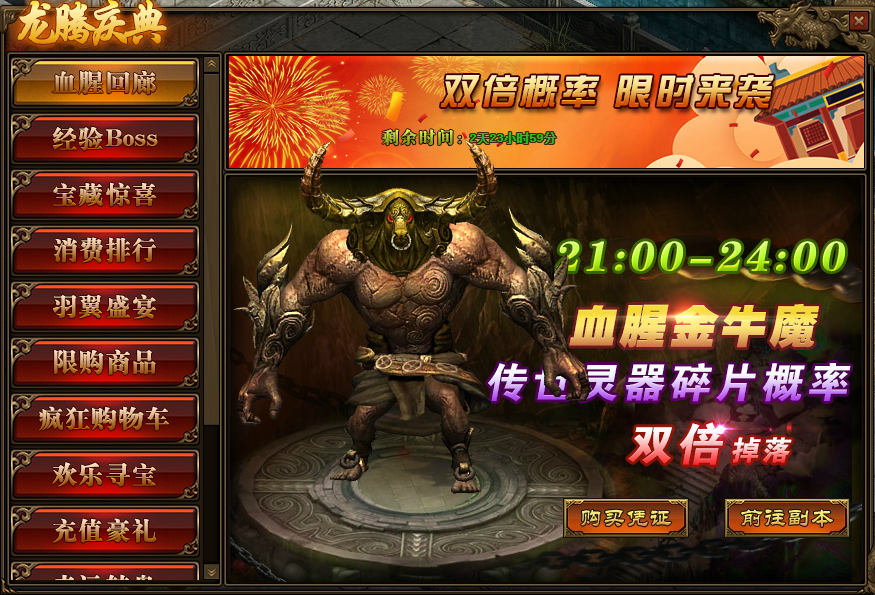 1.活动期间,玩家参与“多人副本-血腥回廊”,获得“传世灵器碎片”的概率翻倍;
