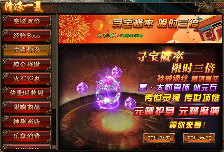 1.活动期间,玩家寻宝概率翻倍,极高几率获得星·太初首饰,特戒钢纹、仙元石、碧落星空,传世灵器、传世灵甲,传世灵器·手镯碎片、传世灵器·项链碎片,元神麻痹特戒以及元神护身特戒