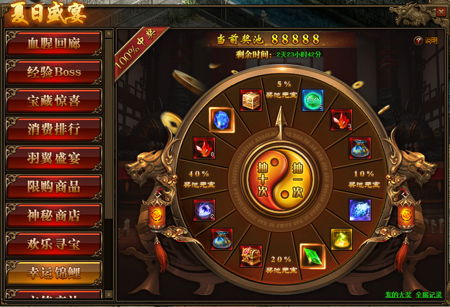 1.活动开启后奖池内默认存入88888元宝,每抽奖1次可使奖池内增加100元宝