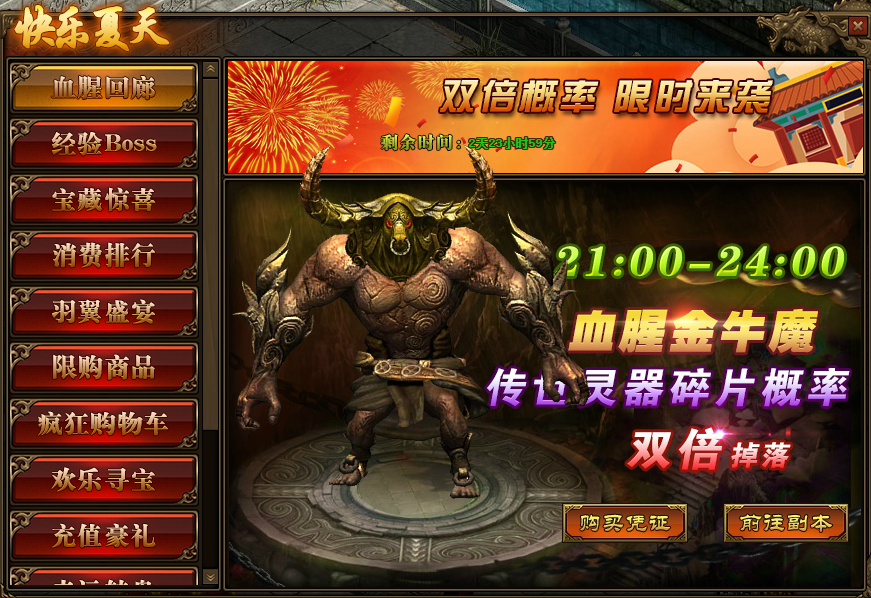 1.活动期间,玩家参与“多人副本-血腥回廊”,获得“传世灵器碎片”的概率翻倍;