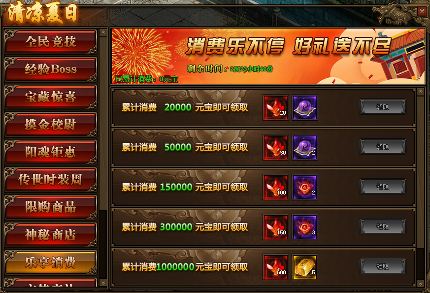 1.活动期间,玩家累计消费满足要求,可以领取境界修为、本职业星石、传世灵戒等相应奖励;