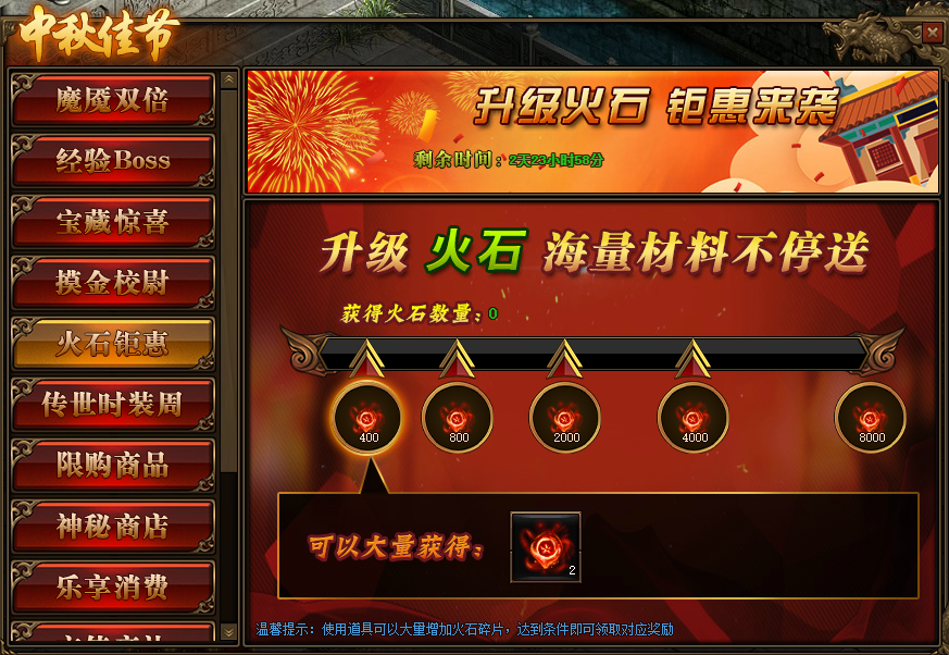 1.活动期间,玩家获得火石碎片数量,达到条件可领取对应火石碎片奖励。