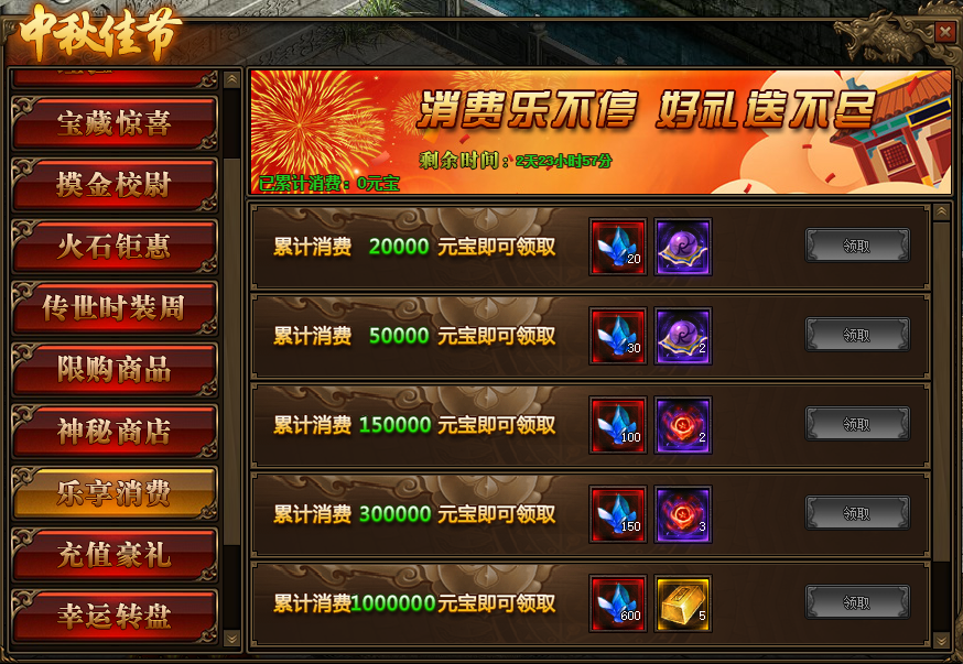 1.活动期间,玩家累计消费满足要求,可以领取境界修为、本职业星石、传世灵戒等相应奖励;