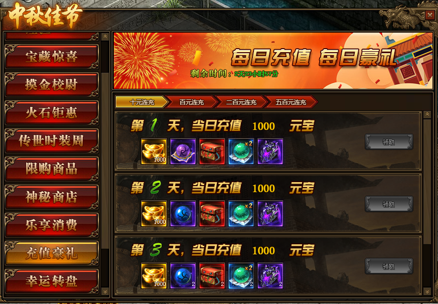 2.连续充值达到3天,奖励翻倍领,更可领取暗影晶石、地狱晶石、随机阵法宝珠宝箱等贵重物品