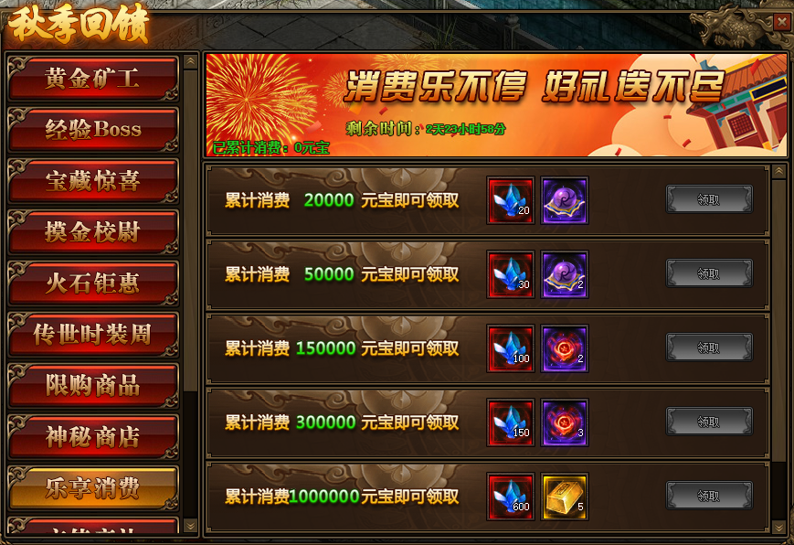 1.活动期间,玩家累计消费满足要求,可以领取境界修为、本职业星石、传世灵戒等相应奖励;