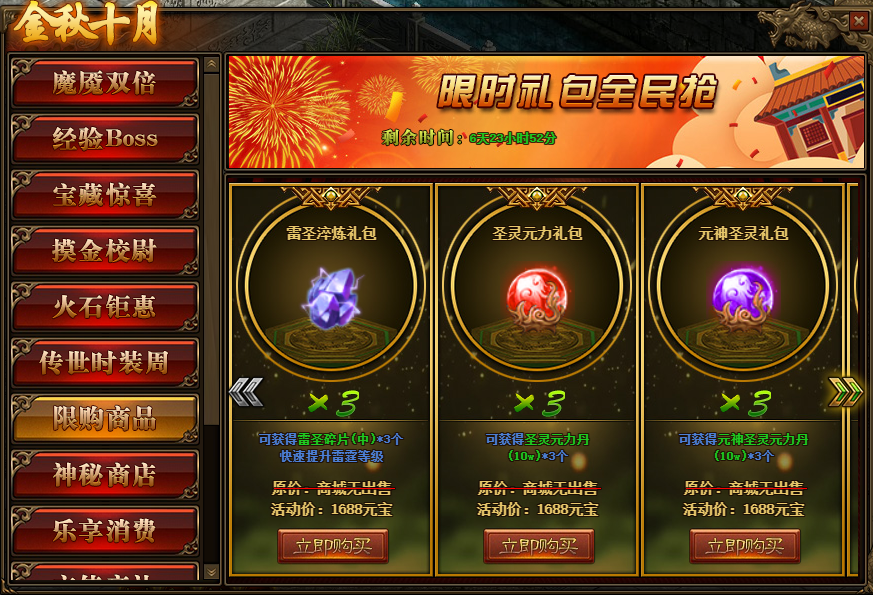 1.活动期间,玩家可在活动面板购买限购商品;(可翻页)