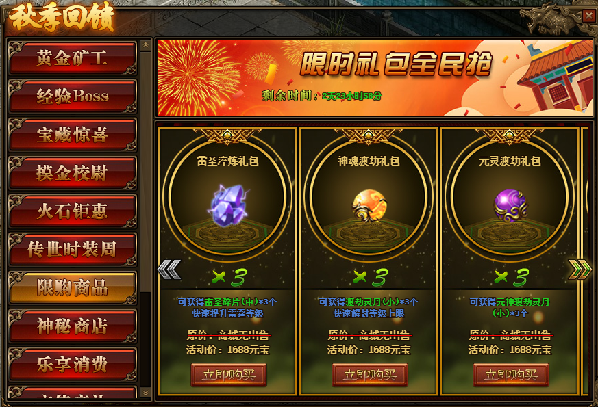 1.活动期间,玩家可在活动面板购买限购商品;(可翻页)