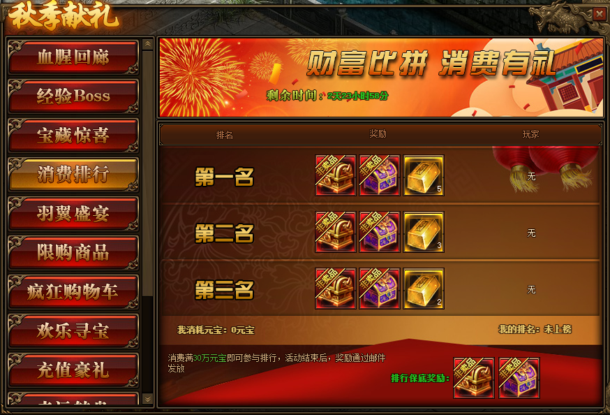 第二名:数一数二自选宝箱,低级灵器自选宝箱*1*1,金条(300w)*3;