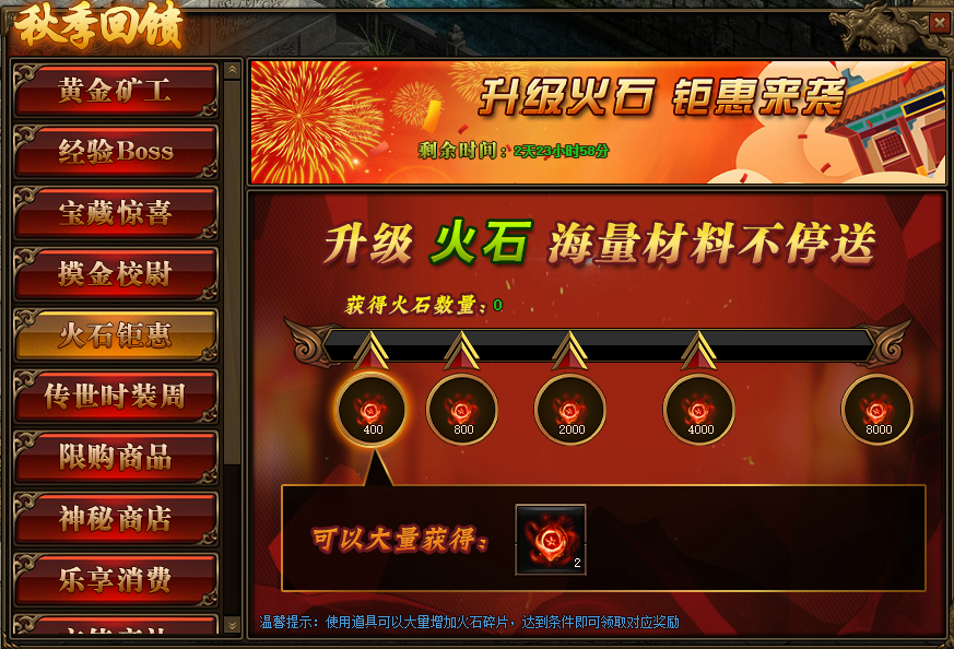 1.活动期间,玩家获得火石碎片数量,达到条件可领取对应火石碎片奖励。