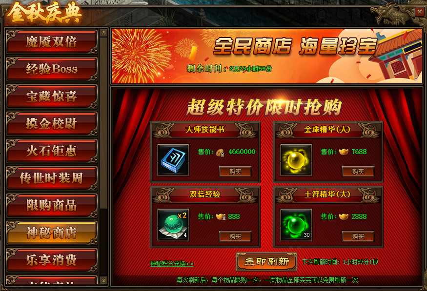 2.神秘商店每2小时自动刷新一次,也可用花费元宝立即刷新;