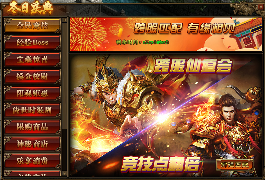 1.活动期间,玩家参与跨服仙道会3V3或5V5匹配,获得“竞技点”翻倍;