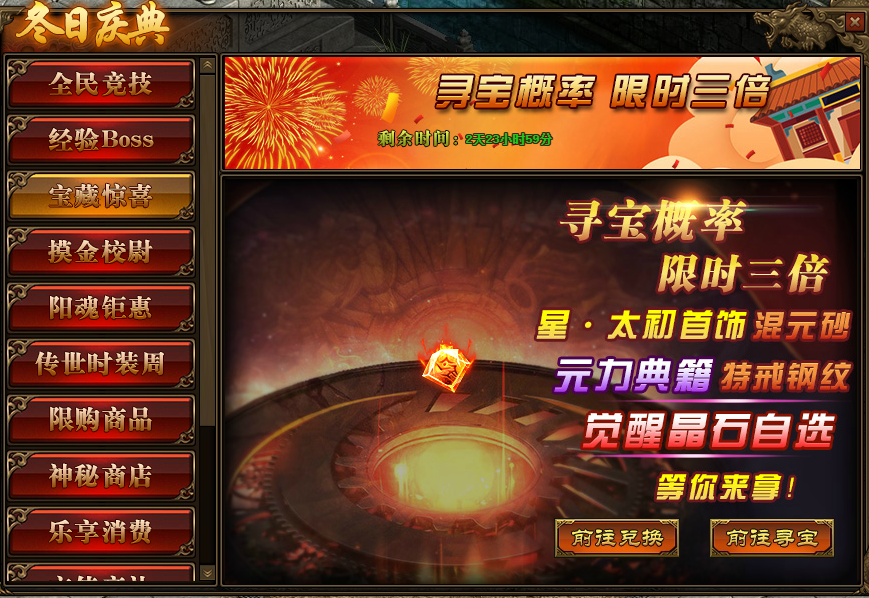 1.活动期间,玩家寻宝概率翻倍,极高几率获得星·太初首饰,传世灵器、传世灵甲,特戒钢纹,混元砂,传世灵器、传世灵甲,不灭意志典籍、元力回响典籍以及觉醒晶石自选宝箱