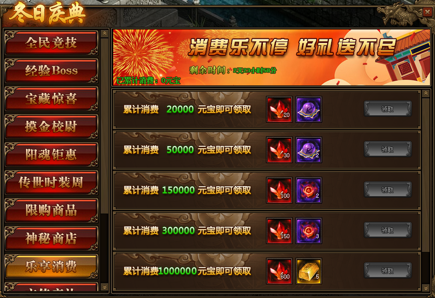 1.活动期间,玩家累计消费满足要求,可以领取境界修为、本职业星石、传世灵戒等相应奖励;